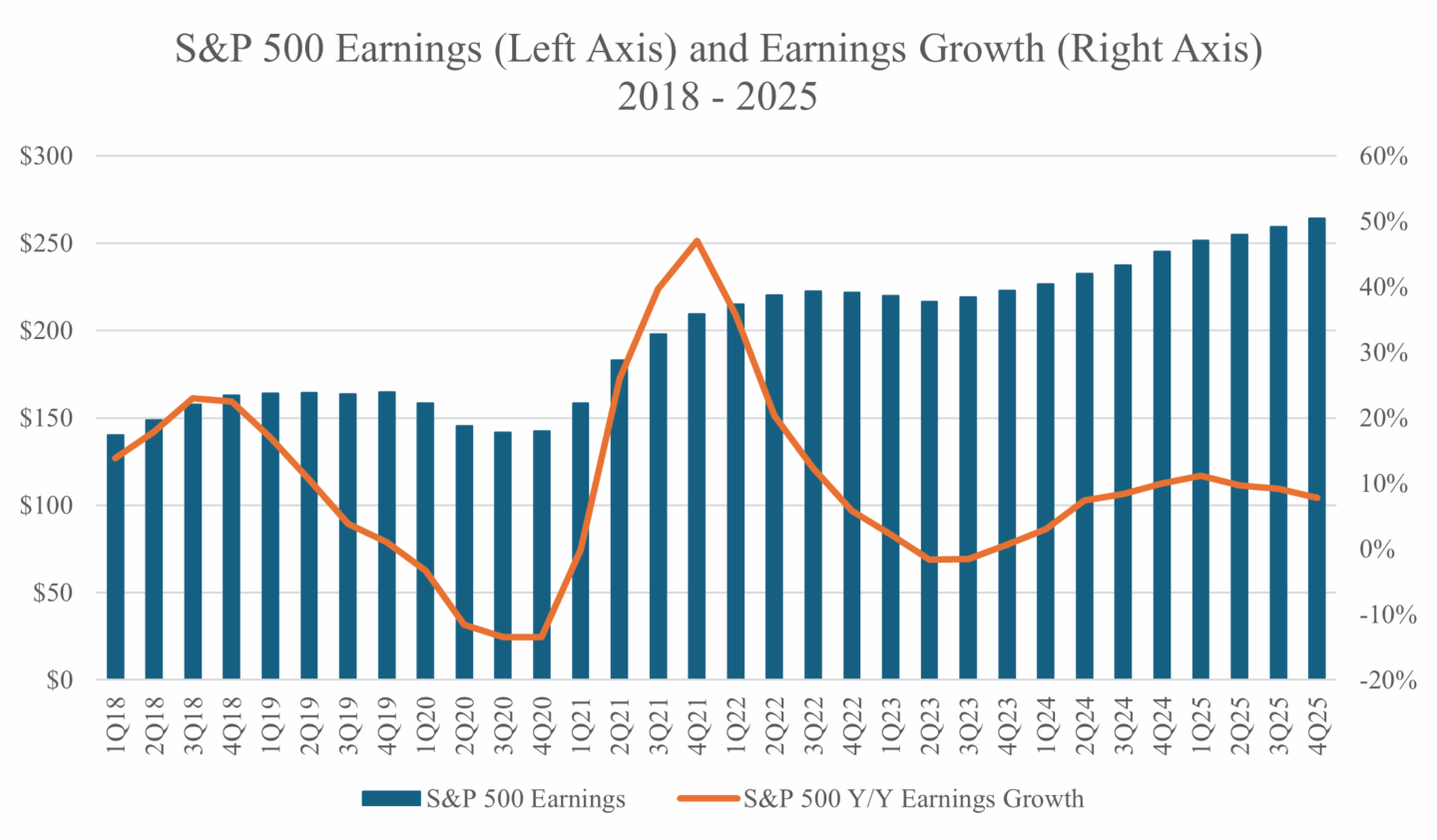 Looking forward, corporate earnings expectations for 2025 have moderated but, so far, positive growth is still expected. We expect that there will be some struggles with supply chains as companies adjust, but ultimately profits will recover and stock prices will follow along.