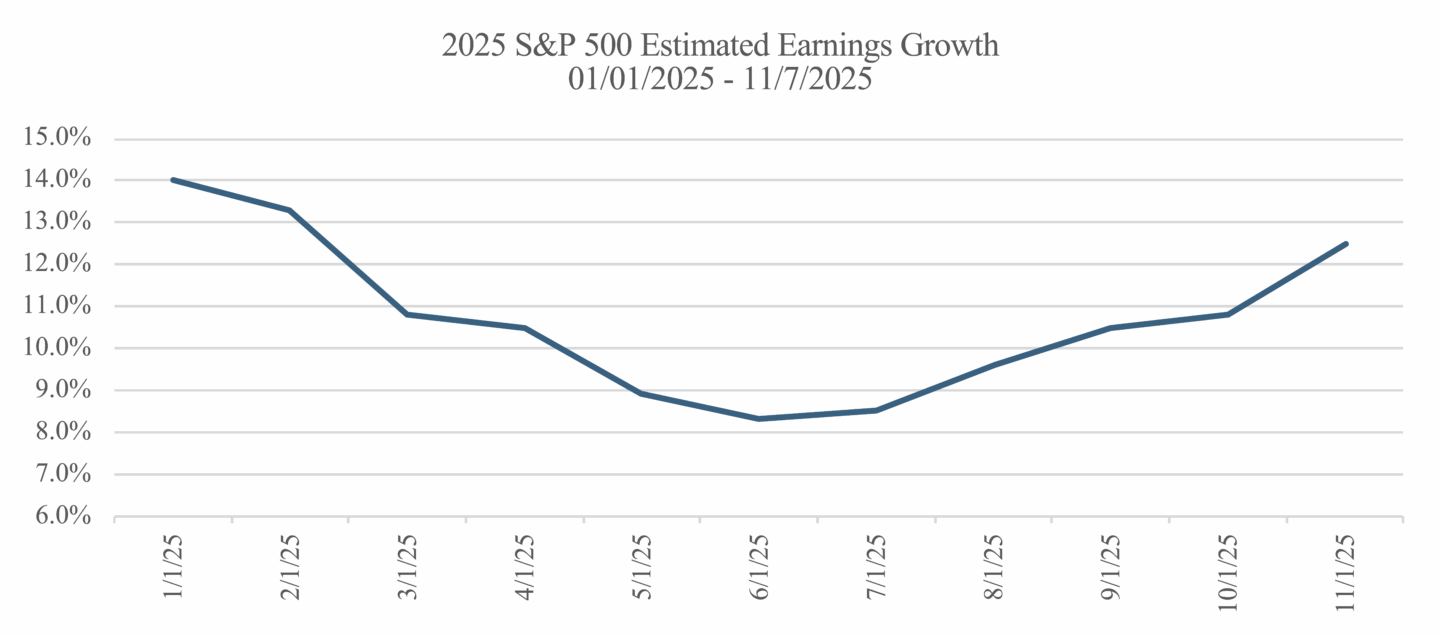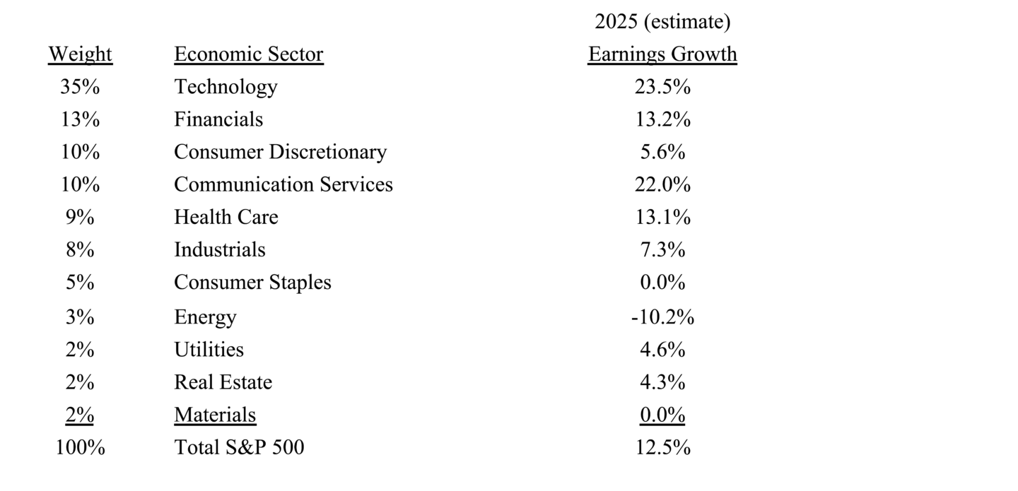 The new year started with high expectations of 14% year-over-year earnings growth and it dropped to 8.3% growth by the middle of the year before moving upward again.  As of last week, expectations are for 12.5% earnings growth for 2025.  Since the year is almost over, Wall Street analysts are usually fairly confident in the outcome by this time.