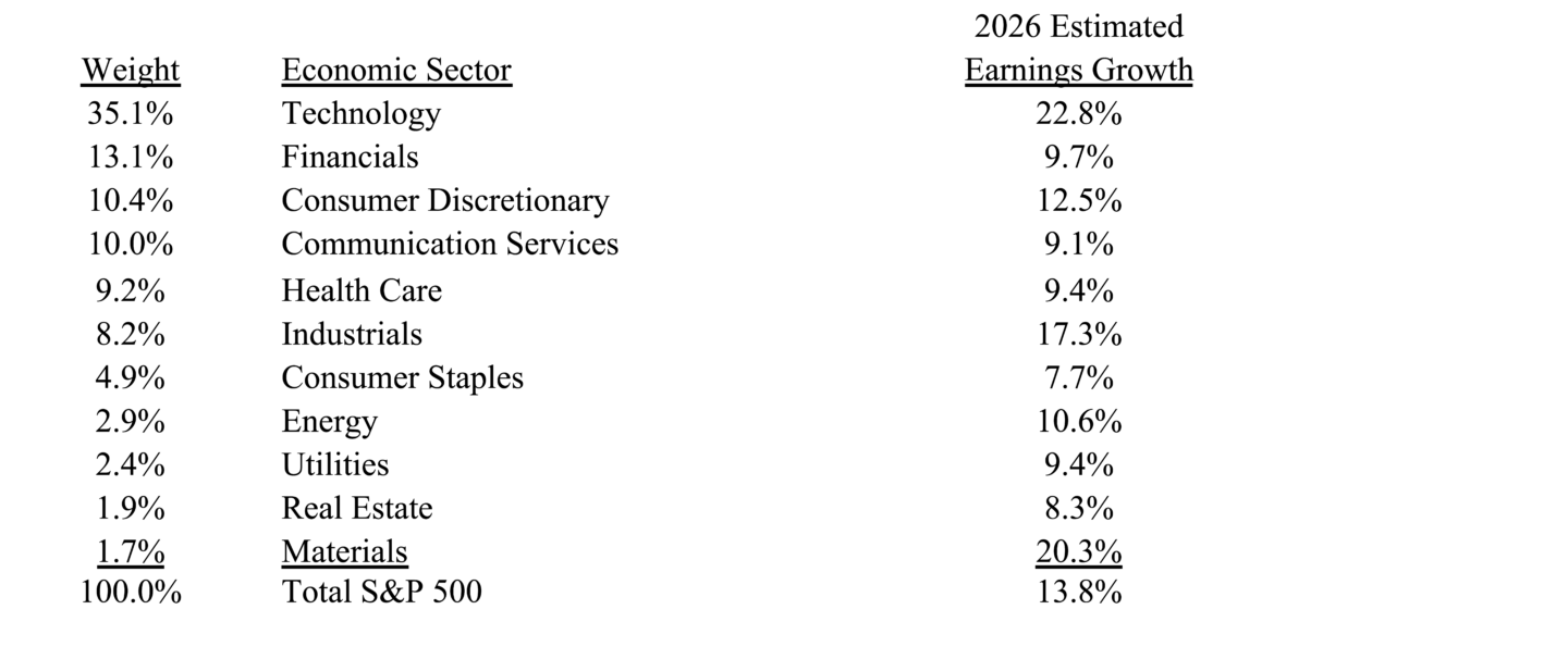 Looking forward to 2026, Wall Street analysts continue their optimism.  Sector growth is more broad-based, with all sectors expecting at least high single-digit growth and technology leading the way again with 22.8% earnings growth currently forecasted.